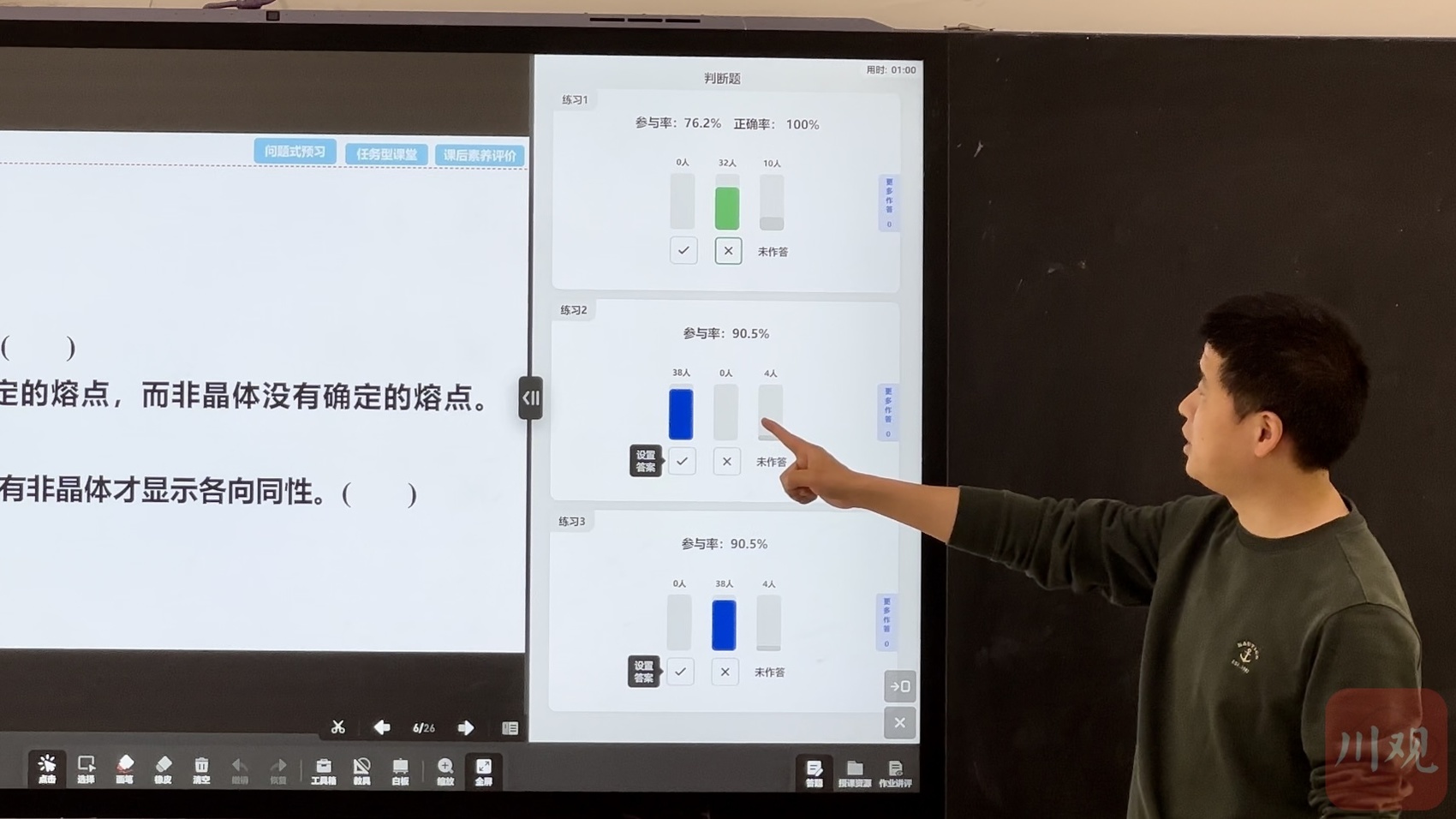 张涛将题目放在屏幕上,同学们用点阵笔在特制的作业本上作答。记者看到,随着测验的进行,屏幕上迅速有实时数据统计出来,多少同学做完了第一道题,多少同学已答到第三题,每道题正确率是多少,几个错误选项分别有多少同学“踩雷”......各项数据以柱状图的方式在屏幕上动态呈现,简洁明了。几分钟后,所有同学完成作答,张涛立刻复盘,对每道题的知识点、易错点一一点评。