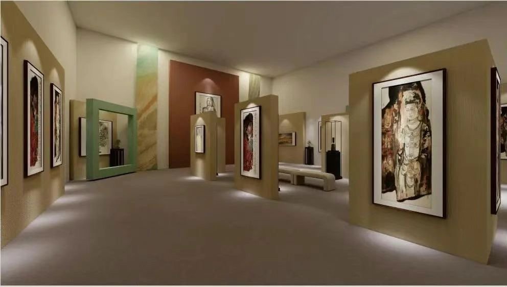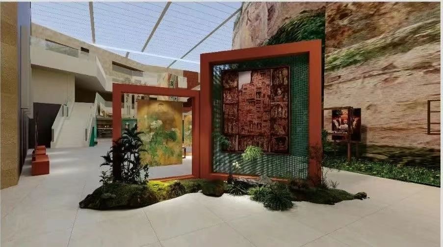 突破传统展陈框架,展厅内运用红砂岩地质元素与数字技术融合,构建沉浸式石窟叙事空间。沿三江流域鹅卵石小径步入展厅,触手可及的粗粝岩壁与全息投影的凿石声场交织,动态还原乐山大佛开凿场景;汉代崖壁造型的展框装置与崖墓洞穴投影形成时空折叠场域,让千年工匠号子与当代艺术解析形成声画对话。