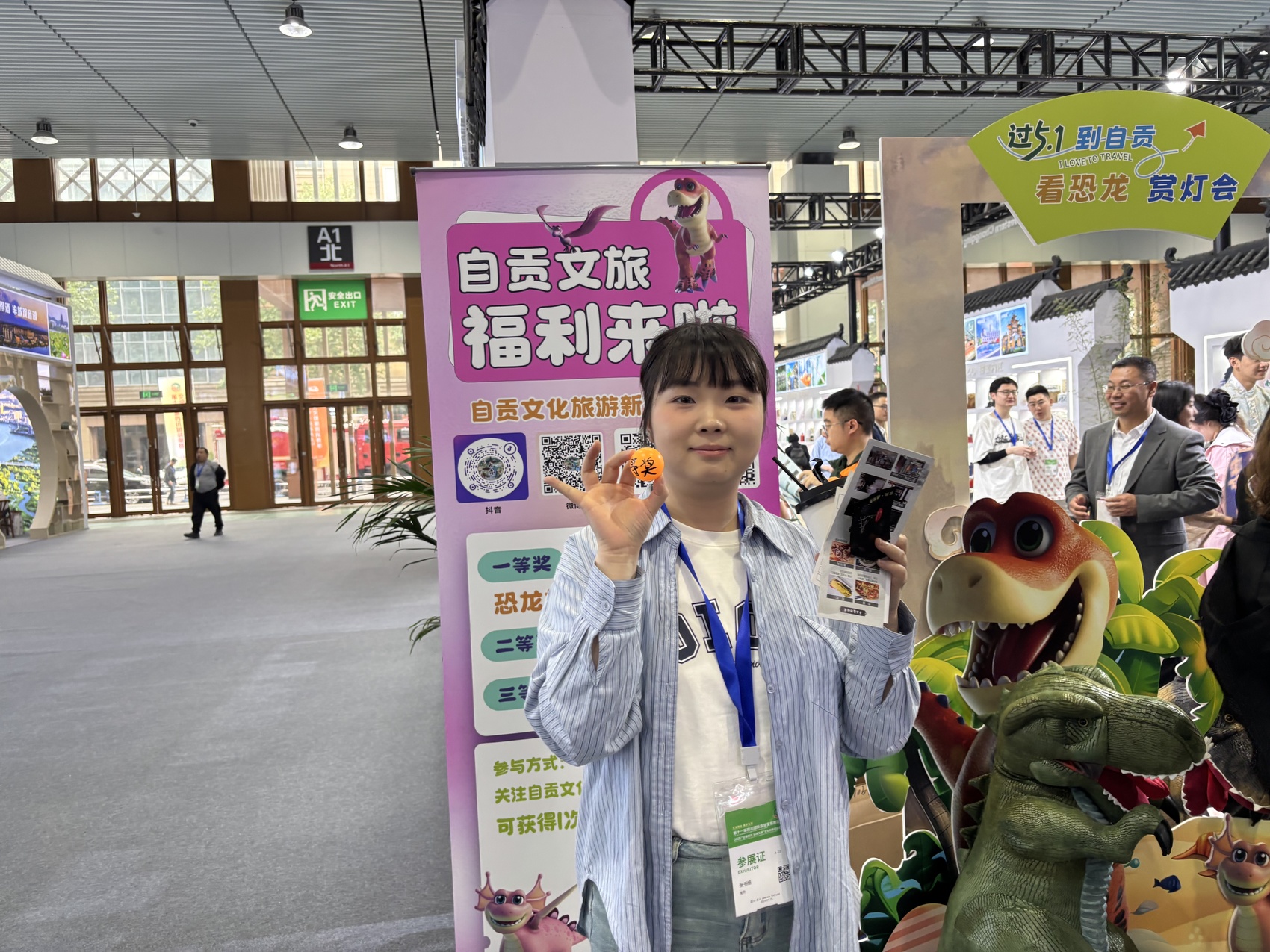 活动现场,琳琅满目的特色文旅商品和文创产品,让川南渝西文旅融合发展联盟展区人气爆棚,参观者络绎不绝。自贡展位以沉浸式体验打造文旅盛宴:游客不仅能品尝到冷吃兔、手撕兔等麻辣鲜香的盐帮美食,还能欣赏黄市草编、扎染丝巾等非遗技艺与燊海井盐文创、恐龙公仔等创意设计的视觉碰撞。此外,现场免费提供的自贡全域旅游手绘地图与经典旅游线路宣传单等为游客出行提供全方位出游攻略,现场更有恐龙十三太保人偶与游客贴身互动,免费的抽奖活动引爆欢乐氛围,灯会门票、冷吃兔等惊喜礼品将城市魅力融入趣味体验。