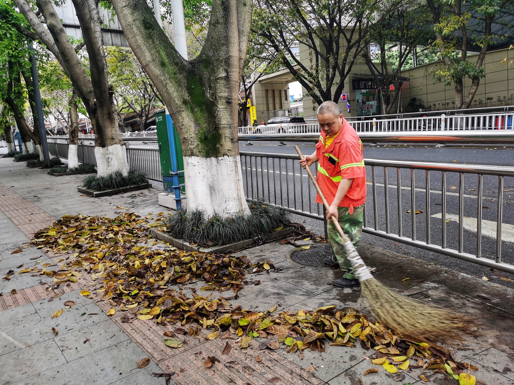 “每天从头到尾地要扫两次,叶子加起来差不多有千把斤。”最近,泸州市江阳区连江路一段,黄叶满枝、落叶成毯。每天清晨、下午,这段路上便响起一阵持续的“沙沙”声,环卫工人张祖东挥着扫帚将满地的落叶扫成一堆又一堆。