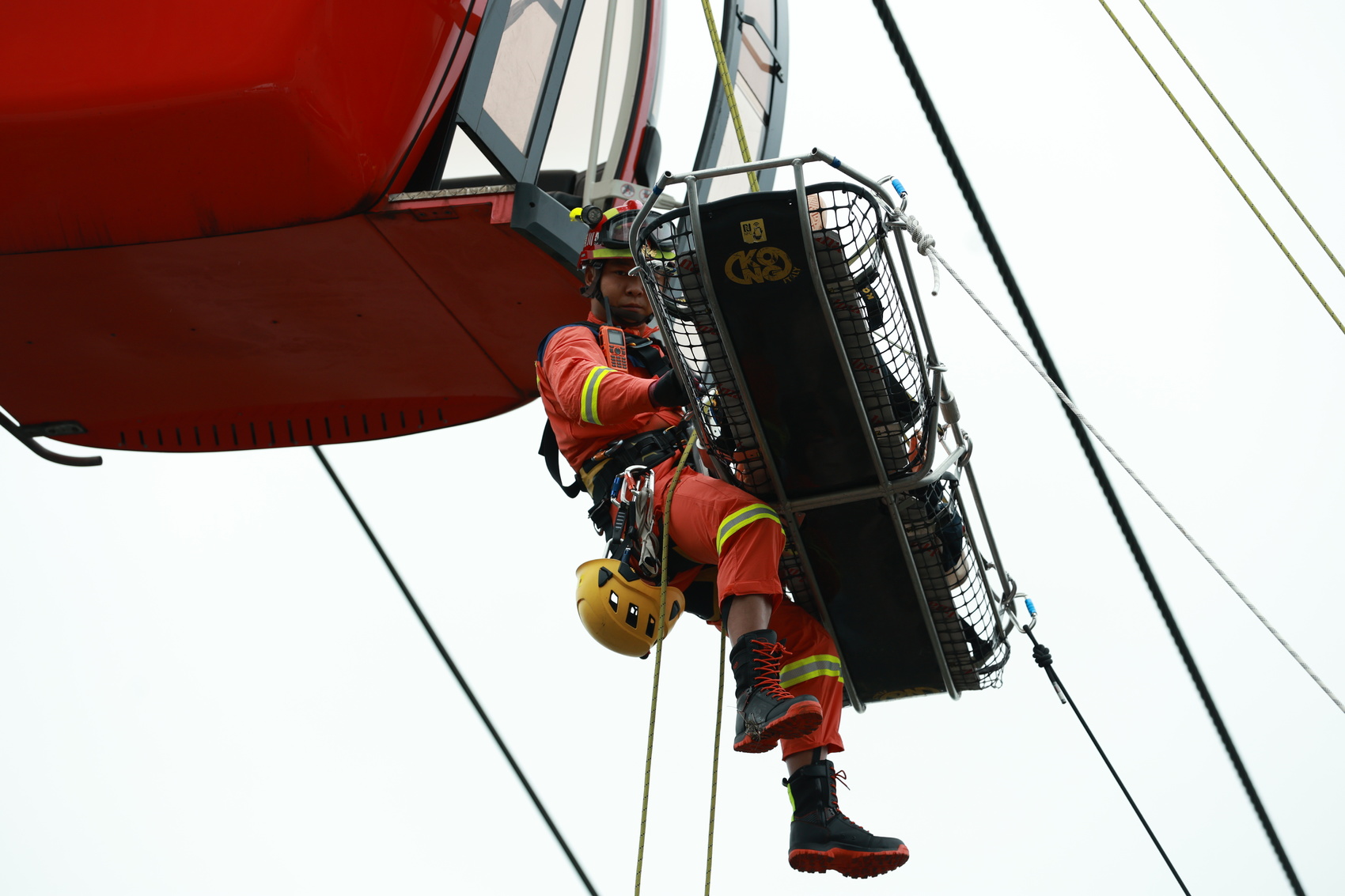 难度最大的是线路救援。索道停运后,模拟一名乘客突发心脏病被困在索道舱中,情势危急,消防员搭建绳索系统,沿着索道爬进客舱,并用担架成功将乘客吊运至地面;一处客舱距离地面约50米,消防员通过绳索系统,从地面垂直爬入客舱,将被困乘客护送至地面。