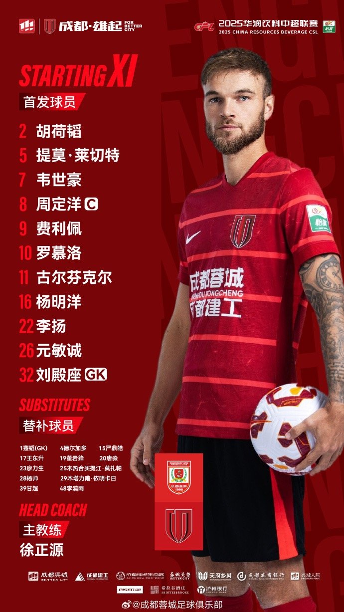 或许是考虑到球队本赛季遇弱不强的顽疾,成都蓉城主教练徐正源依旧派出了费利佩、罗慕洛、周定洋、古尔芬克尔、提莫以及韦世豪、胡荷韬、刘殿座等3名国脚在内的全主力阵容。