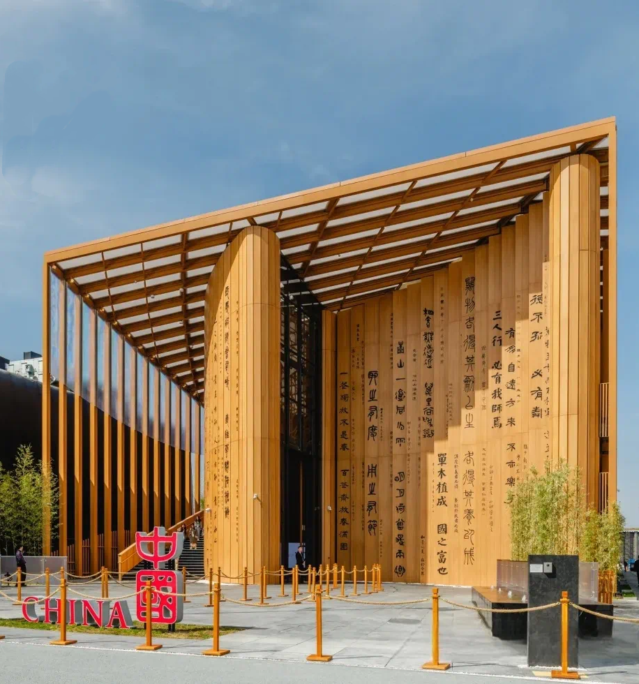 作为进入中国馆的必经之处,人行通道竹栏杆以竹钢和麻绳为材,竹钢坚韧环保,麻绳柔性自然,二者交织成一道兼具功能与艺术的屏障,与中国馆“中华书简”的建筑意境相映生辉。