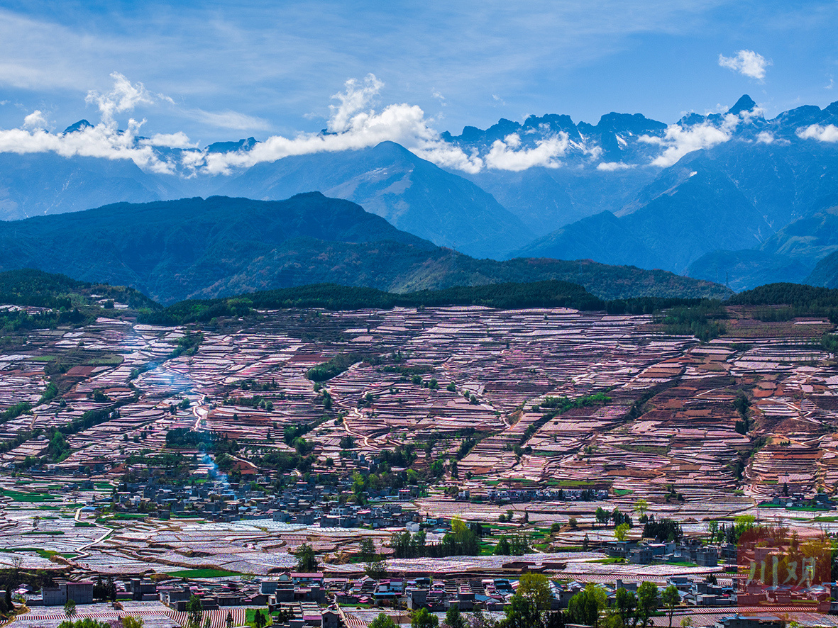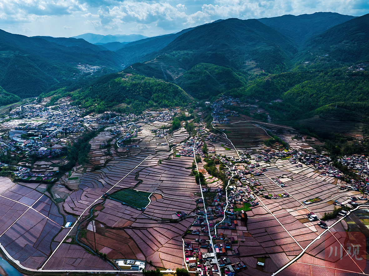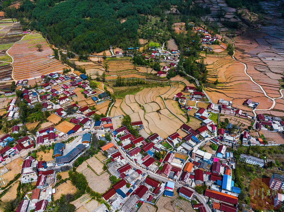 群山怀抱中,越西县新民镇的梯田层叠如画。
