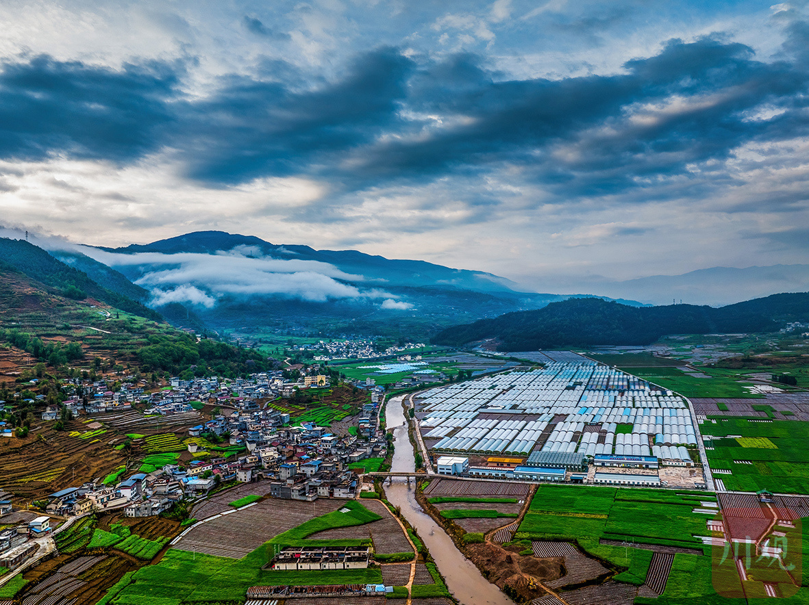 越西县普雄镇阳坡村,层层叠叠的梯田、错落有致的村庄与整齐排列的蔬菜大棚相映成趣。