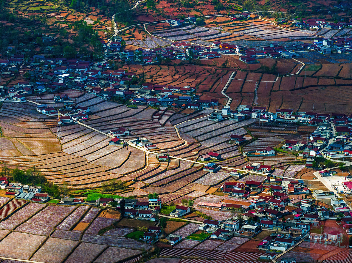 越西县普雄镇阳坡村,梯田与村庄相互映衬。