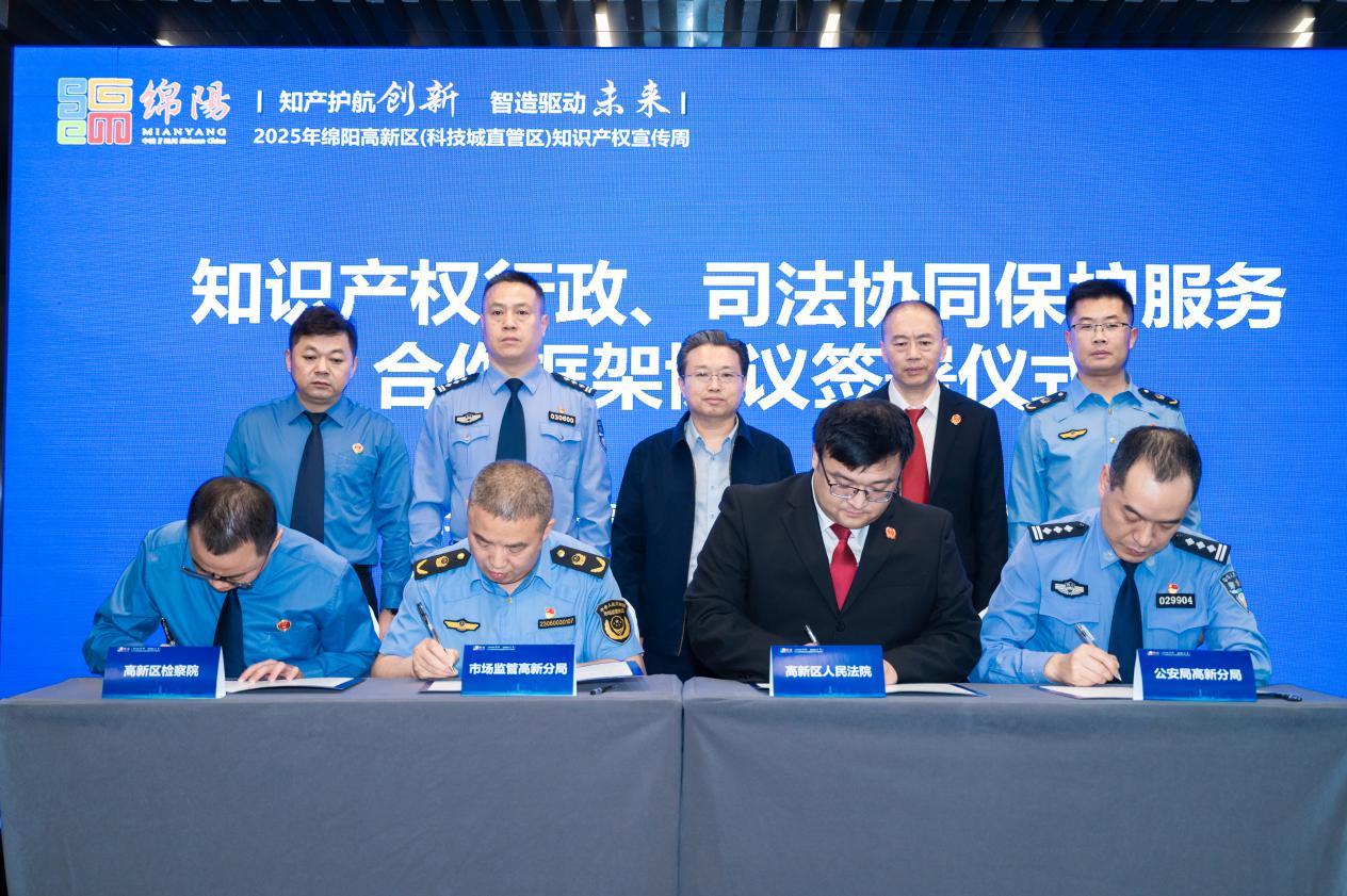 活动现场,绵阳市市场监管局高新分局、市公安局高新分局、绵阳高新区人民法院、绵阳高新区人民检察院共同签署了《知识产权行政、司法协同保护服务框架协议》,同时将联合印发《关于加强知识产权协同保护工作机制的意见》,进一步丰富知识产权行政、司法协同保护服务平台的作用和内涵,同时也标志着几部门在知识产权协同保护方面站在了新起点,在服务企业发展方面迈入了新阶段。