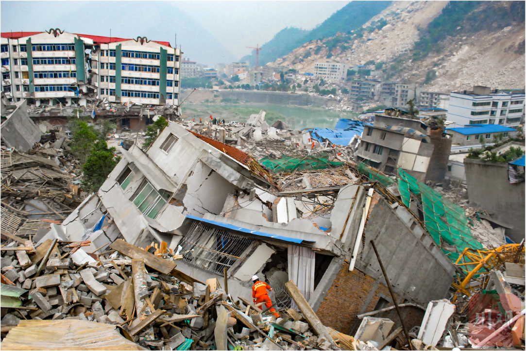 2008年5月17日,北川县城, 消防队员冒险在“5 · 12"汶川地震现场进行搜救。