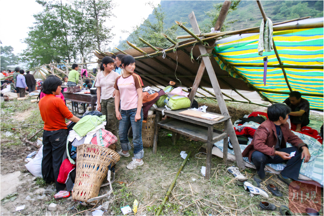 2008年5月16日, 平武南坝镇, 与两姐妹一起被困在大山里的村民搭窝棚自救。