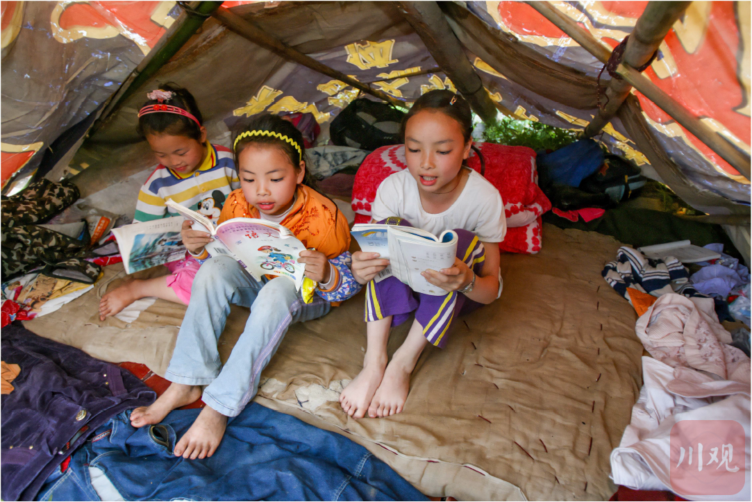2008年5月16日, 平武南坝镇大娅头, 汶川地震后的第五天, 冯小雁(8岁)及姐姐冯雪梅(12岁,右)正在阅读从废墟中捡回来的课本。