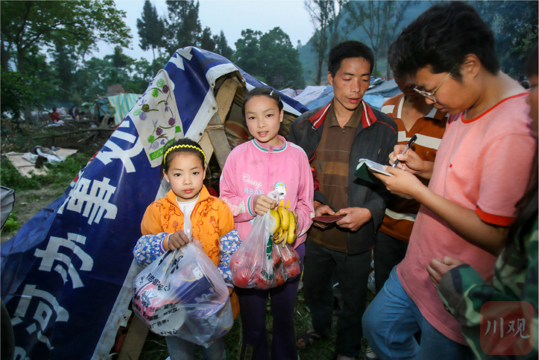 2008年6月27日, 平武南坝镇政府帐篷前, 两姐妹与政府工作人员告别, 即将赴重庆学习生活。