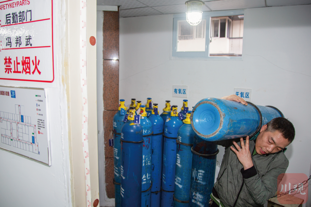 2024年5月1日,重庆九龙坡区,在医院工作的父亲冯帮武搬运氧气瓶。这是他从汶川来渝工作的第16个年头。
