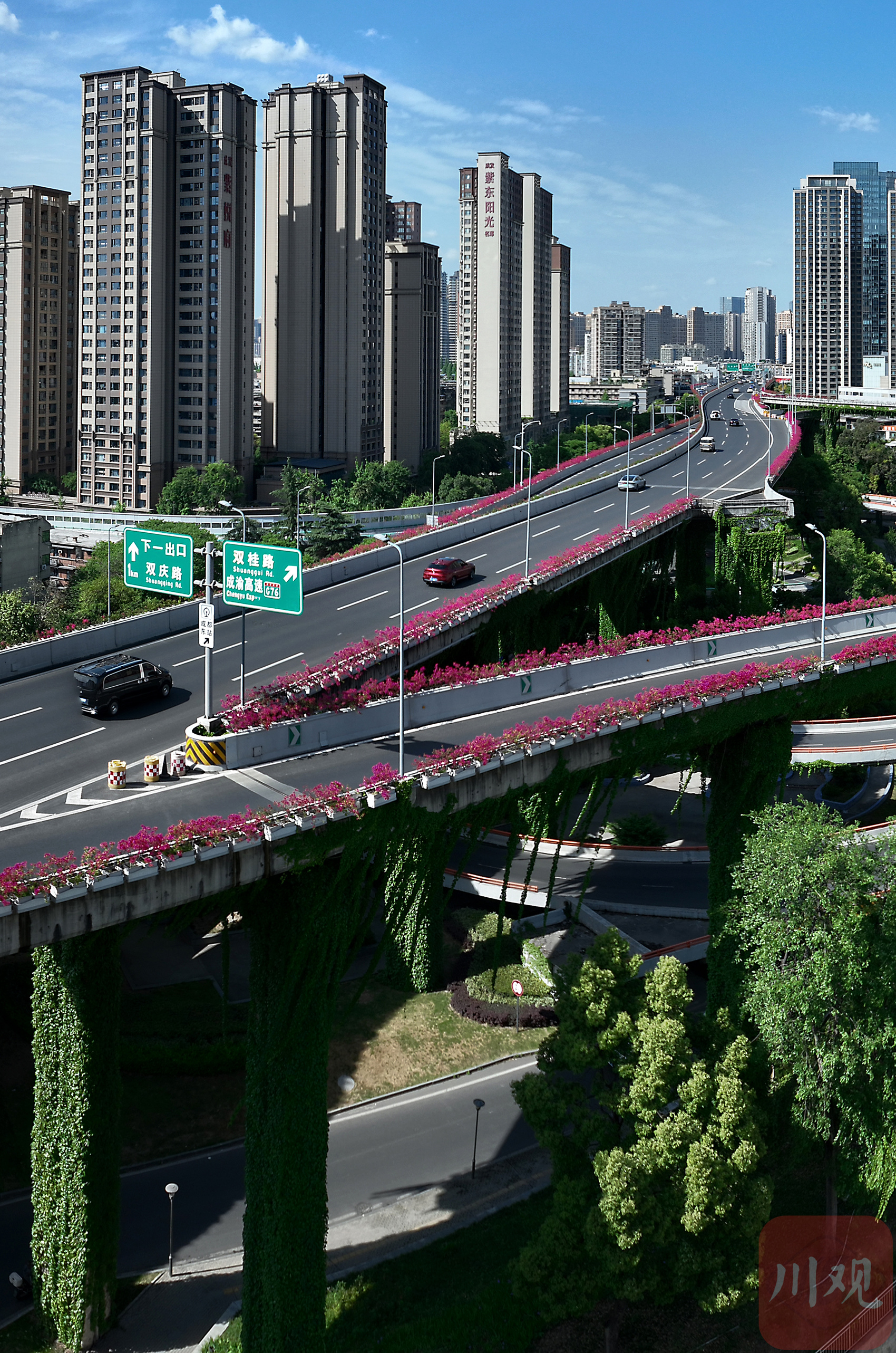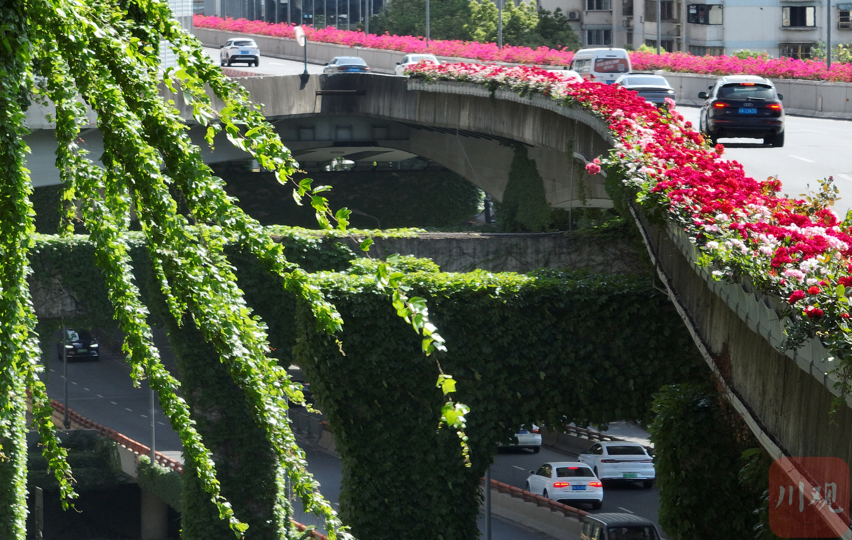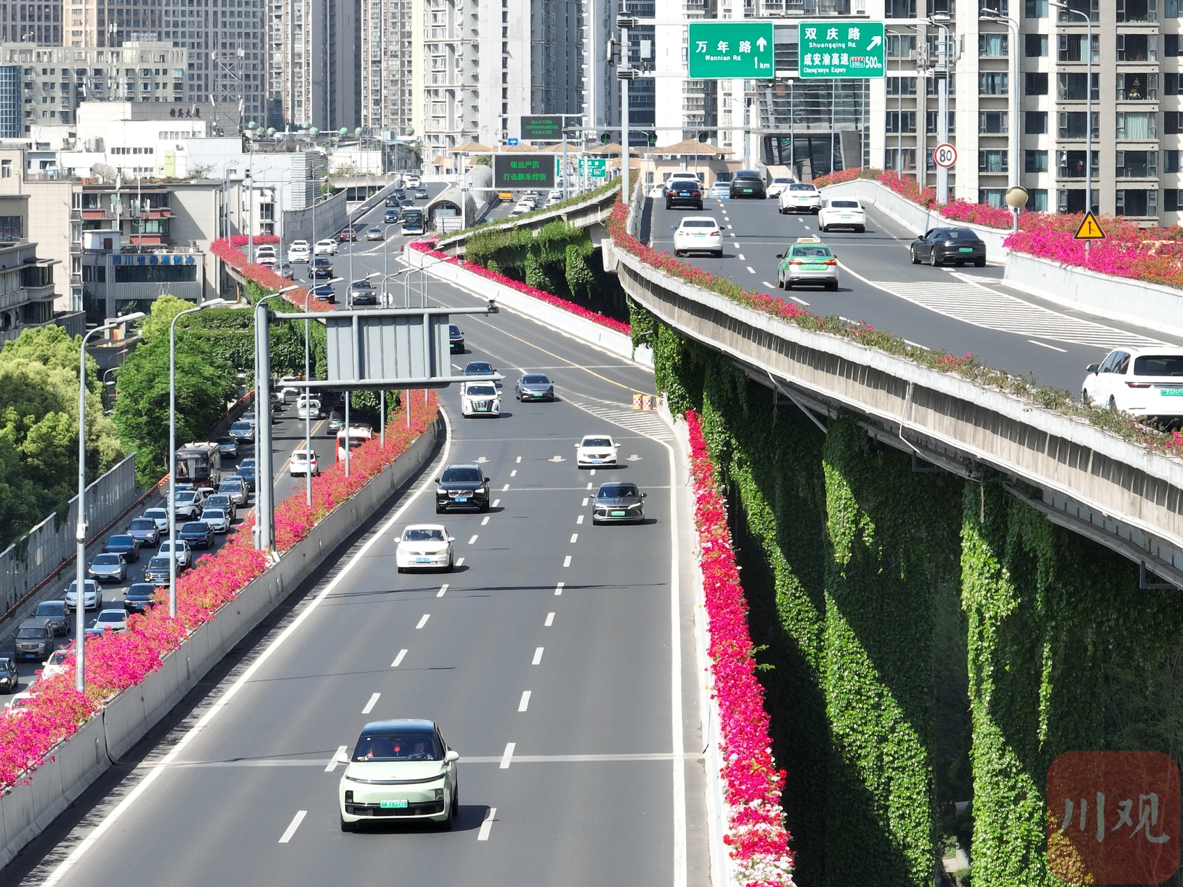 4月27日,气温回升,成都二环高架繁花再开。桥两侧护栏上挂满了艳红的三角梅和粉白的月季,成为乘客眼中流动的风景。
