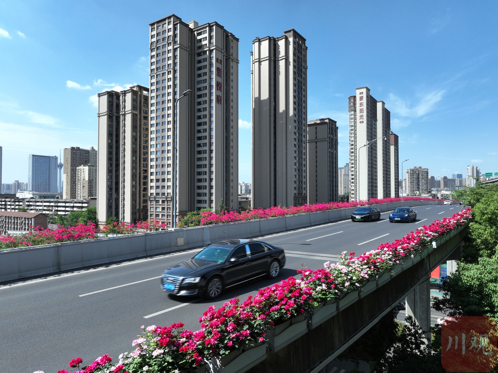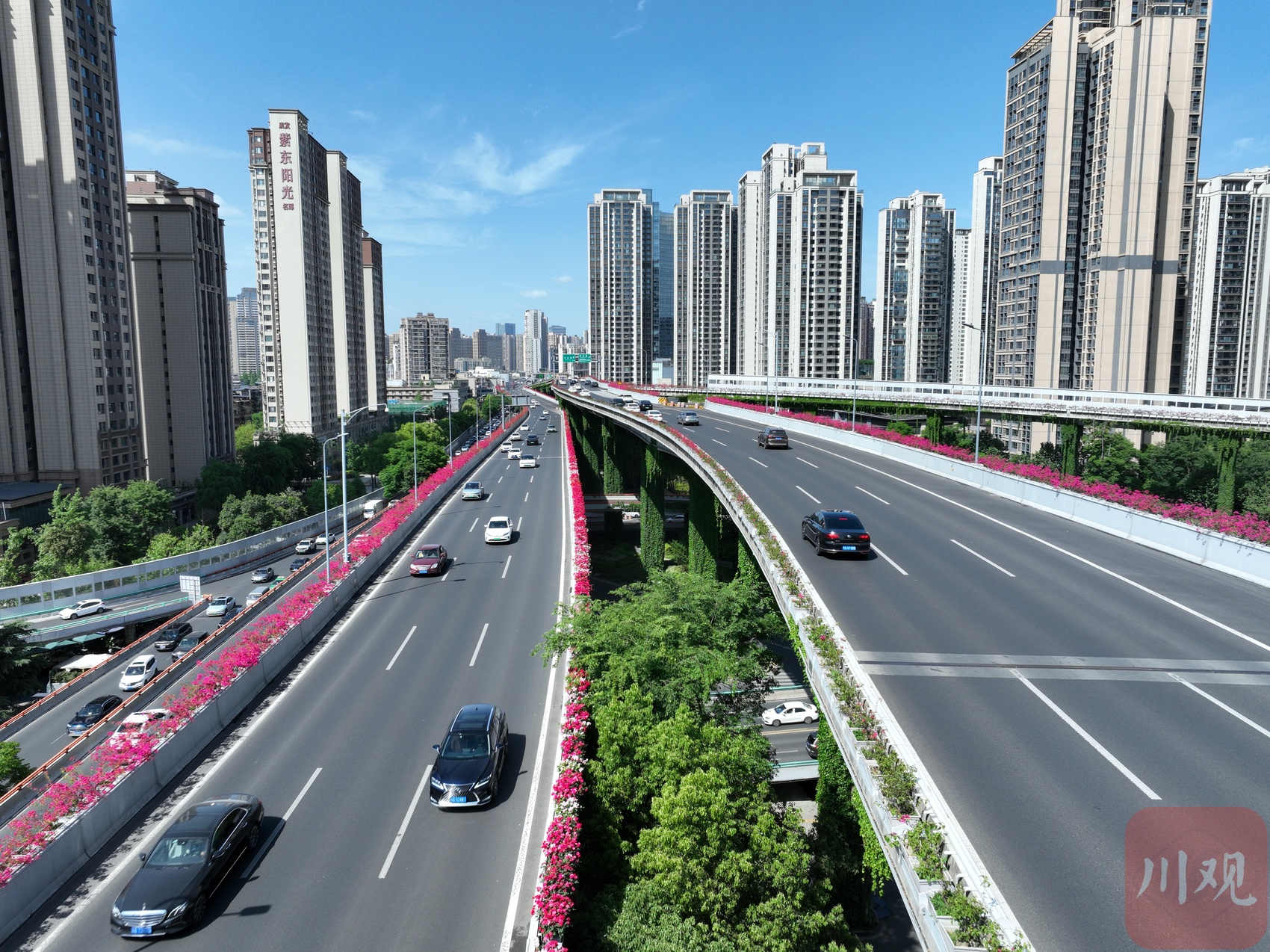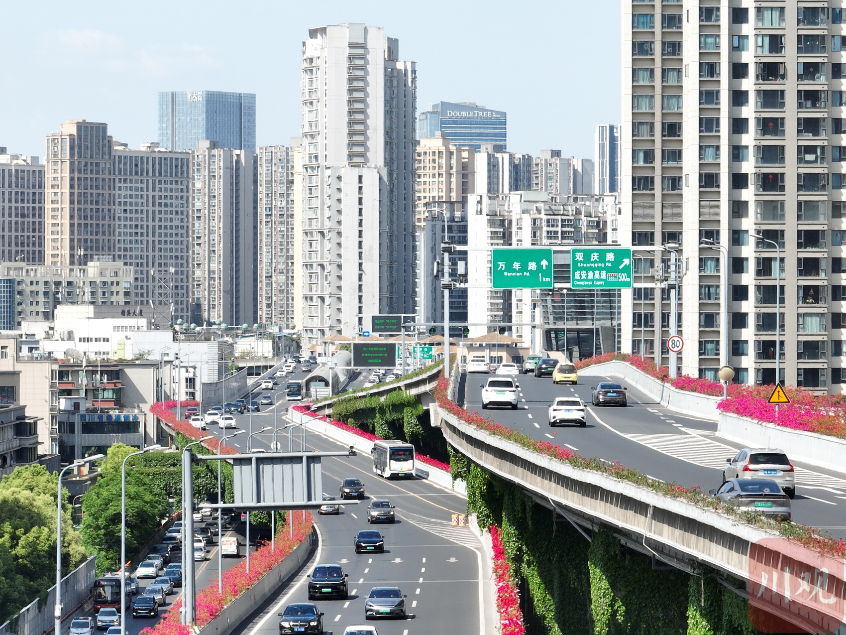 4月27日,气温回升,成都二环高架繁花再开。桥两侧护栏上挂满了艳红的三角梅和粉白的月季,成为乘客眼中流动的风景。