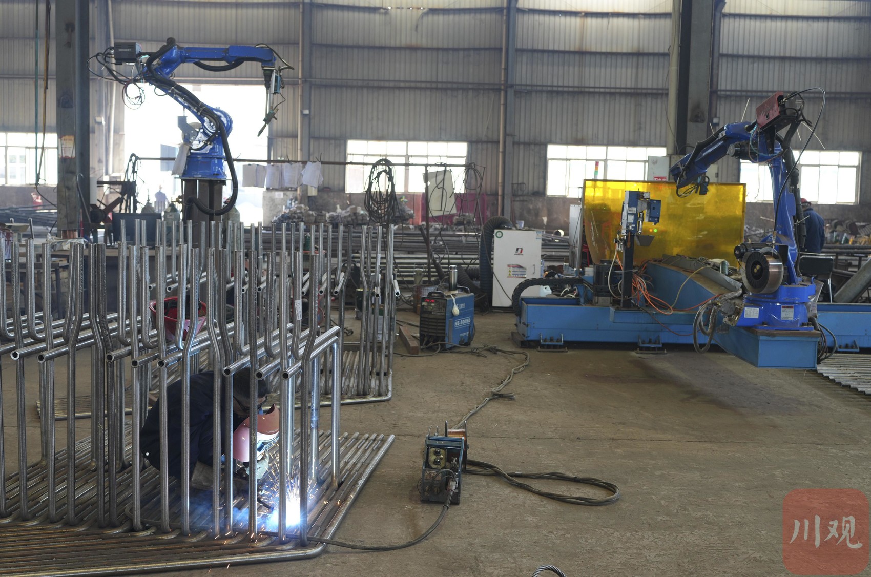 3月24日,自贡荣县的自贡东方气体设备有限公司生产车间内,焊接工人正在工作,他身后的智能焊接机械手也在进行焊接工作。
