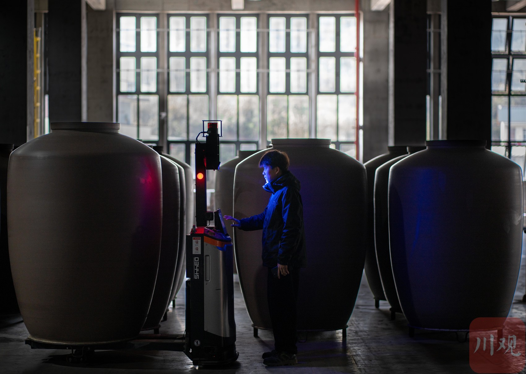 3月21日,技术工人在自贡市荣县双龙陶业制陶车间内调试AGV智能搬运机器人。