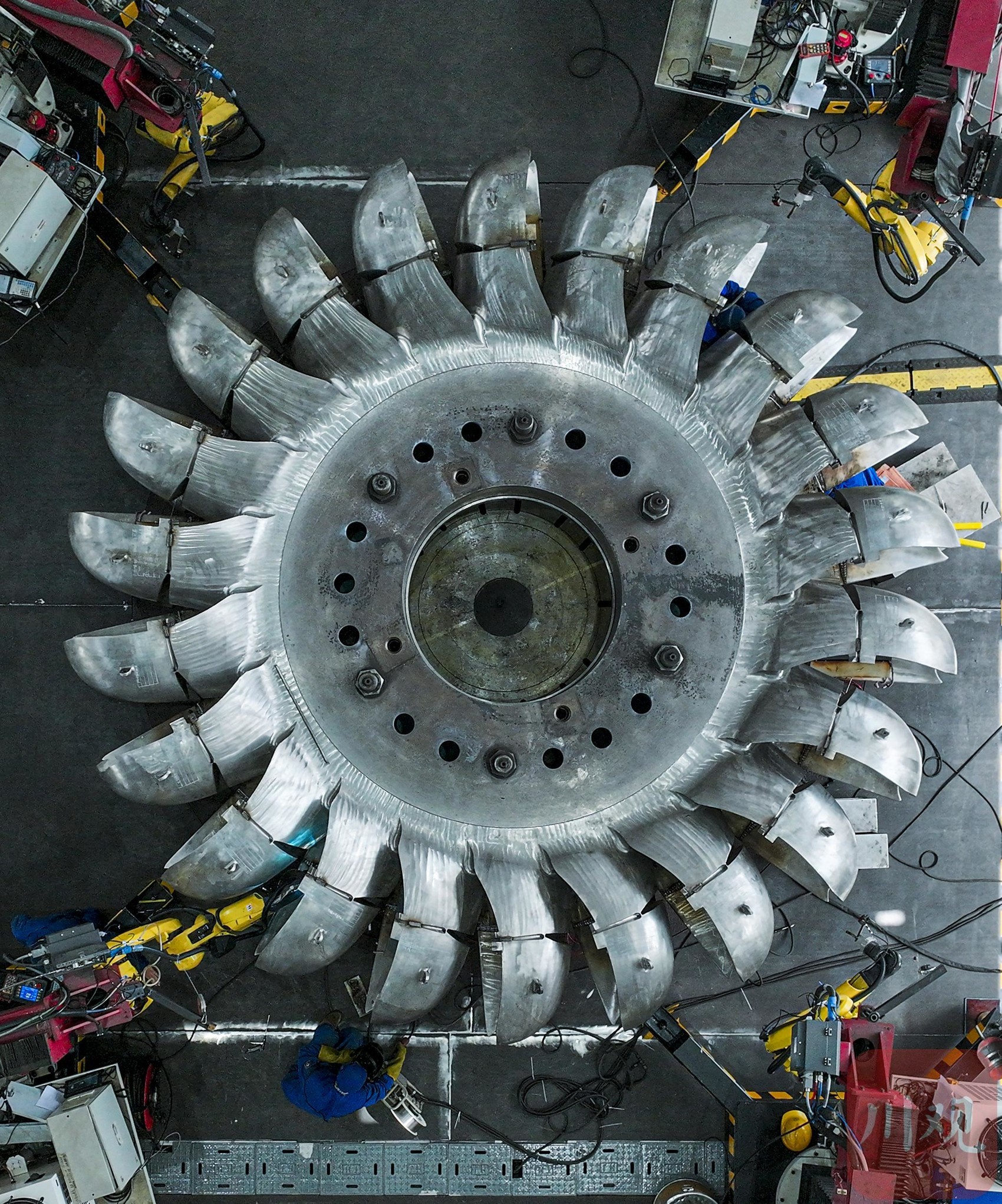 4月15日,东方电气集团东方电机有限公司焊接分厂内,机械臂正在进行世界首台500兆瓦冲击式转轮外部水斗焊接。