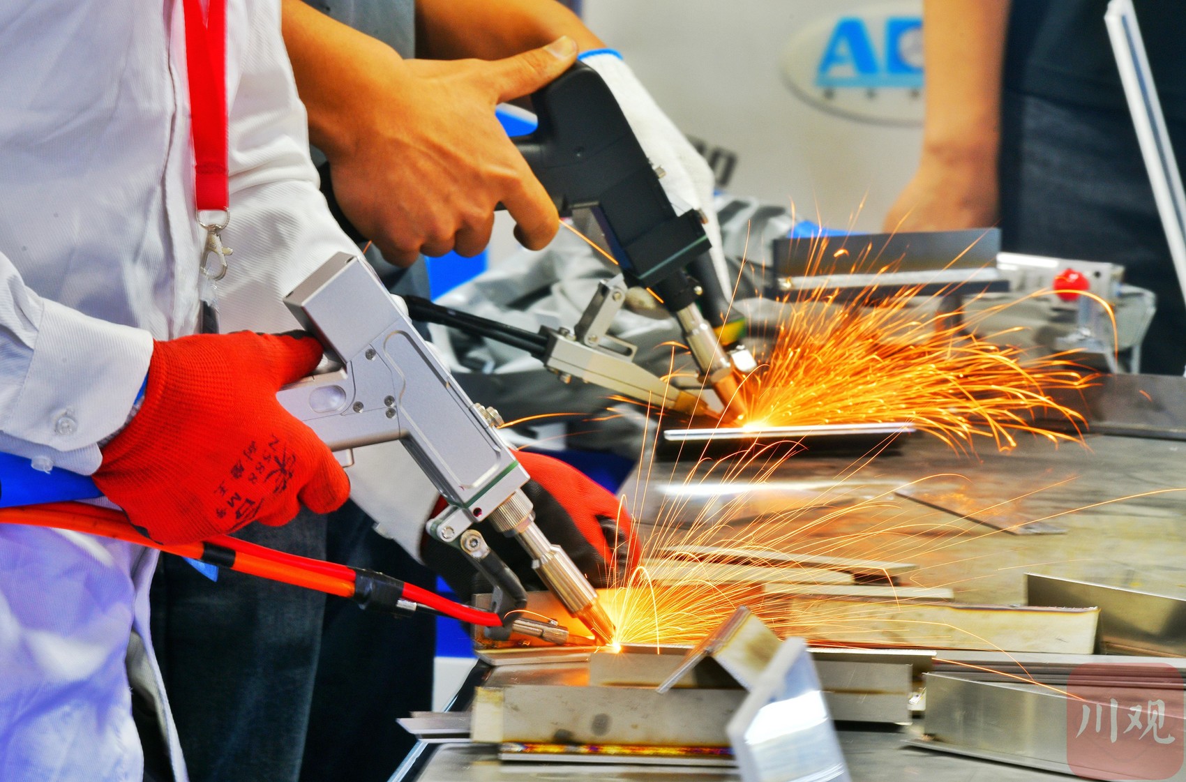 4月23日,成都易镕宜锢科技有限公司的工作人员在2025成都国际工业博览会展台上演示风冷一体式激光焊接机的操作。