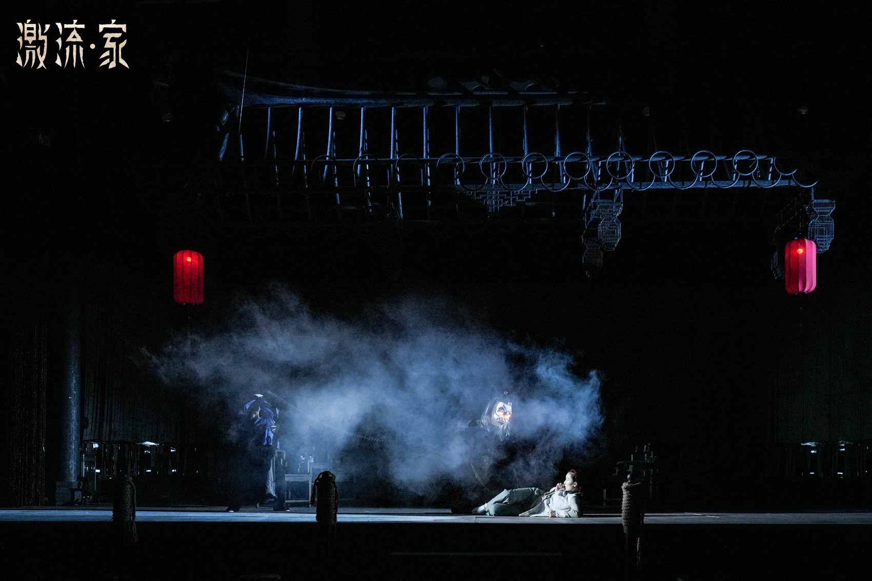 主创团队介绍,剧场内多个观演区的设置,高度还原了巴金笔下高家宅院幽深寂寥、激流暗涌的意象。在互动中,不同观演区的观众都能近距离参与戏剧情境。细腻丰富的光影变幻、空灵柔和的音乐设计等剧场元素,以及川话对白、川江号子、川剧脸谱等,使这部作品与成都有了更为生动的联系。