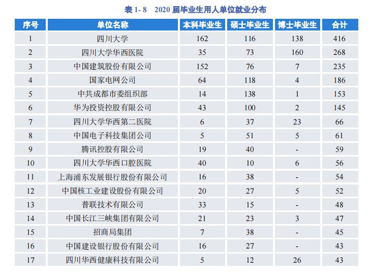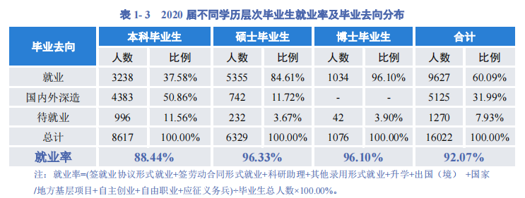 报告显示,截至2020年11月30日,四川大学2020届毕业生共16022人,其中本科毕业生8617人,硕士毕业生6329人,博士毕业生1076人。2020届毕业生总体就业率为92.07%,其中本科毕业生就业率为88.44%,硕士毕业生就业率为96.33%,博士毕业生就业率为 96.10%。