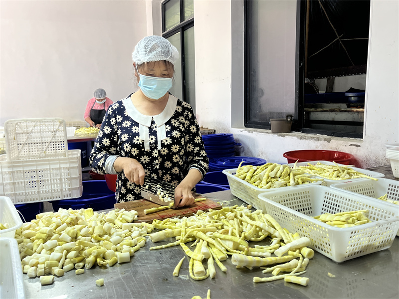 生产车间内,工人们忙着对新鲜竹笋进行剥壳、清洗、蒸煮、切制等工序。一袋袋包装好的笋尖成品整齐地摆放在展示中心,准备销往四川周边及江浙沪等地的食品加工厂。“天池镇适合发展竹产业。营商环境也好。”该公司销售总监包建中对天池镇的营商环境赞不绝口,企业也一口气签了30年厂房租用合同。