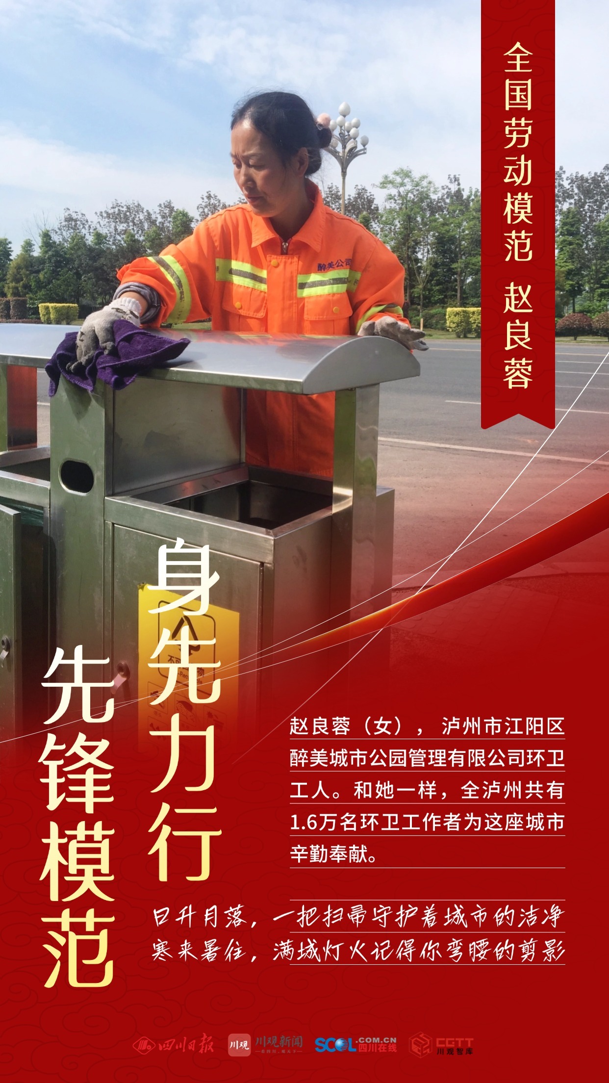 4月28日,庆祝中华全国总工会成立100周年暨全国劳动模范和先进工作者表彰大会在北京举行,来自泸州市的环卫工人赵良蓉荣获“全国劳动模范”称号。