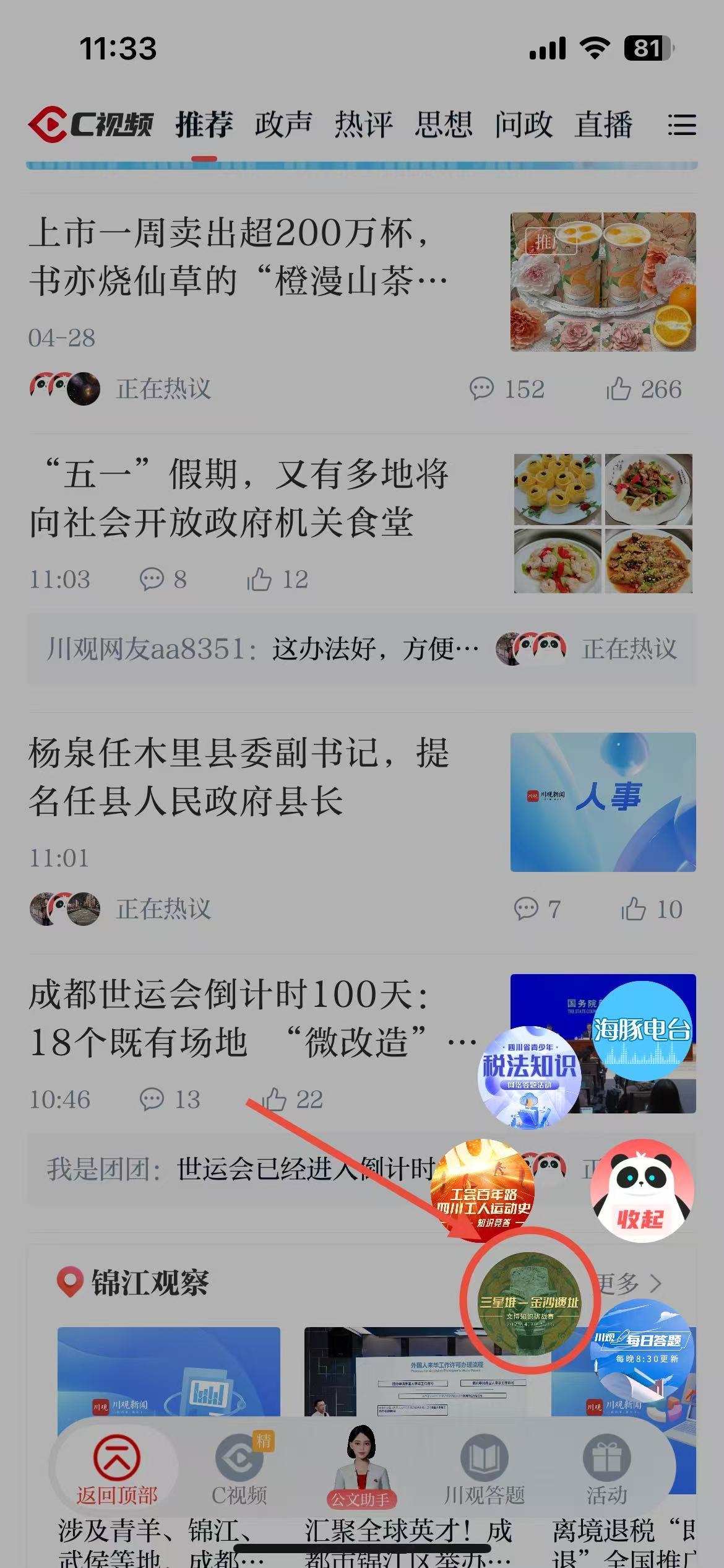 方式一:在川观新闻首页,点击右下方悬浮球,找到“三星堆—金沙遗址文博知识挑战赛”活动图片,点击即可参与;