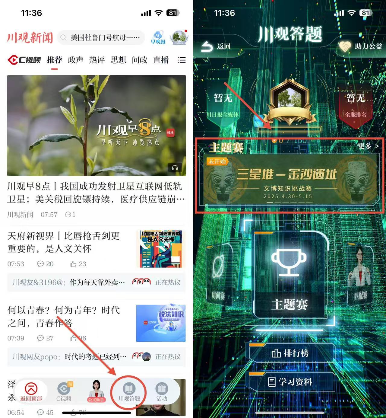 方式二:在川观新闻首页,点击下方“川观答题”,找到“三星堆—金沙遗址文博知识挑战赛”活动图片,点击即可参与;