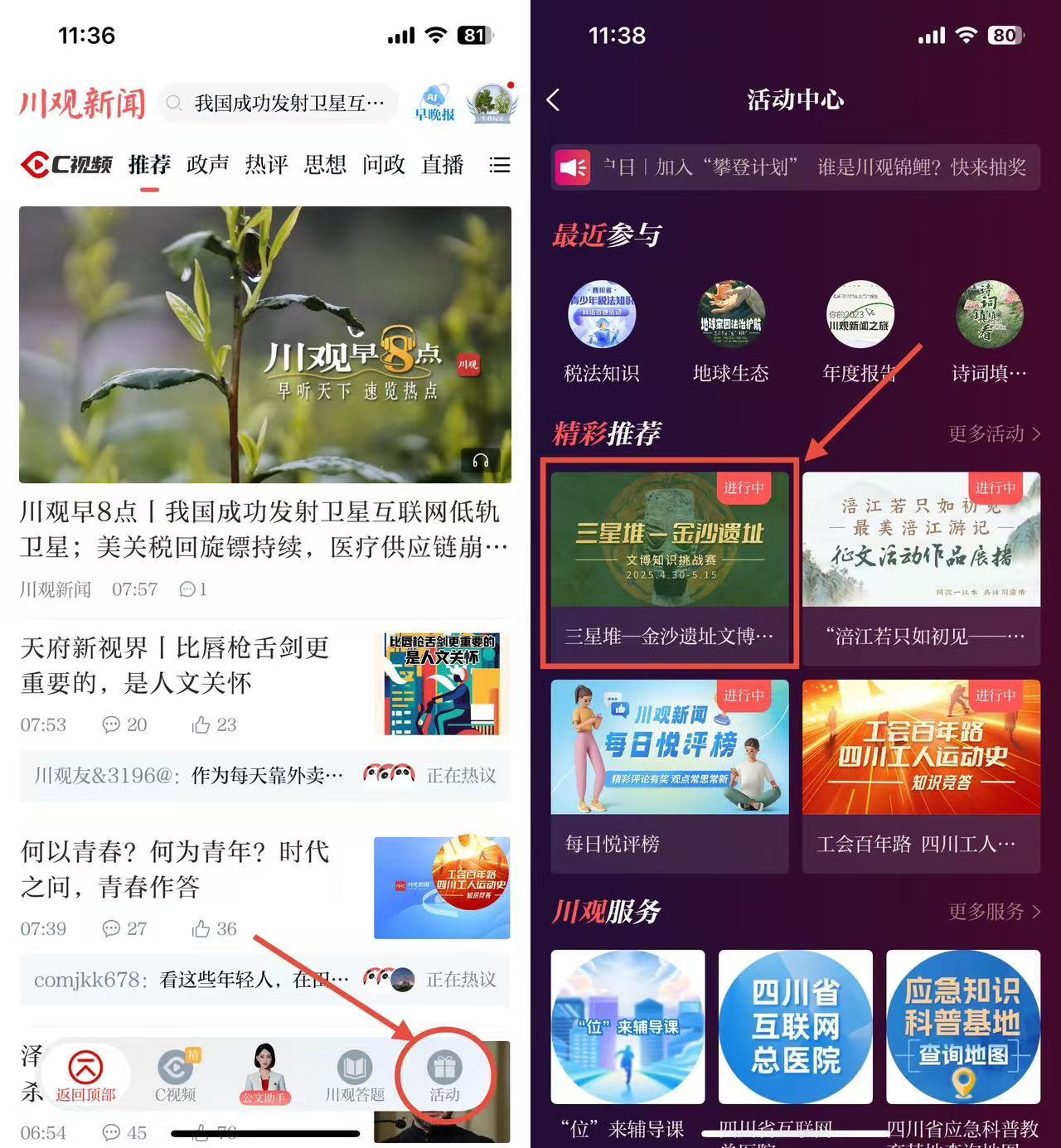 方式三:在川观新闻首页,点击右下角“活动”,点击“活动中心”,找到“三星堆—金沙遗址文博知识挑战赛”活动图片,点击即可参与;