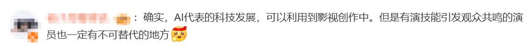 此外,演员于适在采访中谈到了AI时代对演员的影响。他则认为,演员的真情实感是无法被AI替代的。