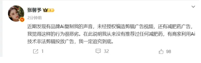 4月18日,女星张馨予在社交平台发文,称有商家利用AI技术复制其声音售卖减肥药,引发关注。