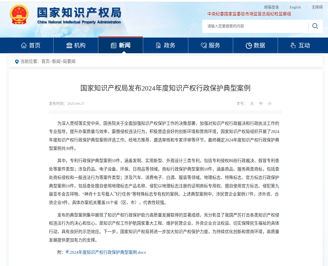 4月27日,国家知识产权局发布2024年度知识产权行政保护典型案例,苍溪县市场监督管理局查办的“侵犯‘苍溪红心猕猴桃’证明商标专用权案”,成功入选全国10件“地理标志、特殊标志、官方标志行政保护典型案例”,成为四川省唯一入选案例,也是该县知识产权保护工作首次获国家级认定。