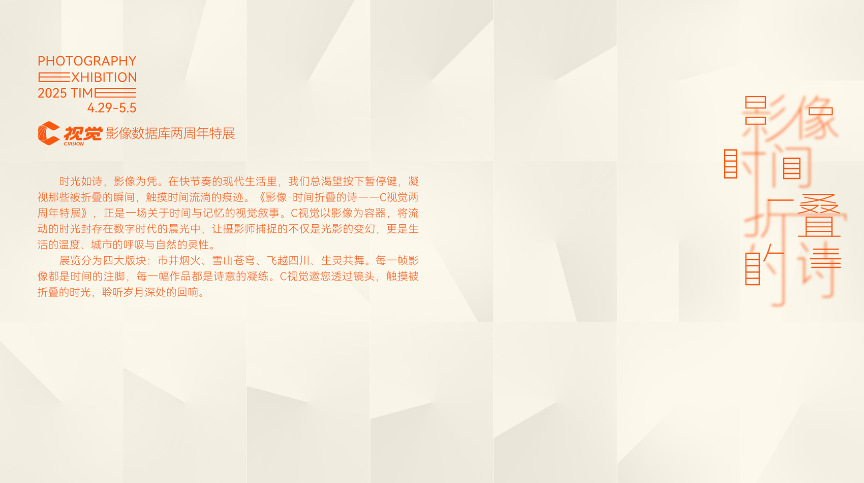 展览分为市井烟火、雪山苍穹、飞越四川、生灵共舞四大版块。每一帧影像都是时间的印记,每一幅作品都是诗意的凝结。观众可透过“C视觉”摄影师的镜头,感受时光的岁月流转,聆听岁月的回响。