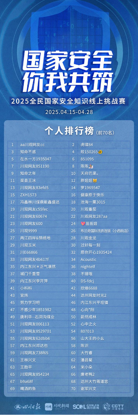 4月28日,由四川省公安厅、四川省教育厅联合川观新闻开展的“国家安全 你我共筑”2025全民国家安全知识线上挑战赛收官,活动共吸引30余万人次参与答题。