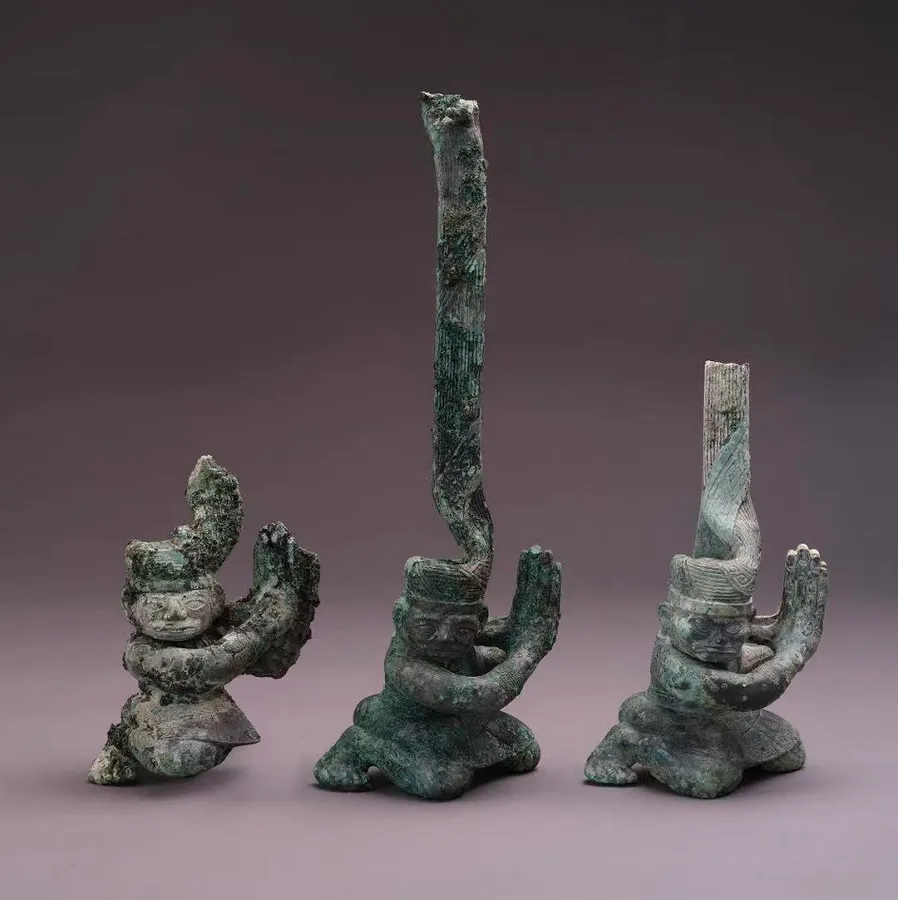 在三星堆所有带人像的青铜器中,来自4号“祭祀坑”的三件扭头跪坐人像非常特别。在冉宏林看来,它们直观、真实地呈现了当时三星堆人的容貌特征,研究价值极高。“面部特征,手指的关节,腿部的肌肉线条,脚趾蹬地的发力状态,生动鲜活,代表了当时中国的写实范艺术风格。”