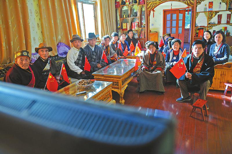 10月18日,黑水县芦花镇铁别村藏寨的党员干部在村民家中收看党的十九大开幕盛况。记者 吴传明 摄