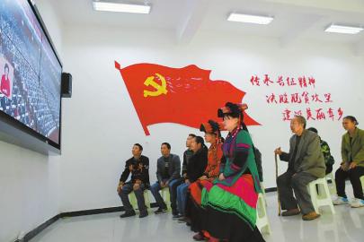 泸州市叙永县石厢子彝族乡堰塘村,第一书记组织村里的彝族同胞集中收看十九大开幕会盛况。 胡润林 摄(视觉四川)