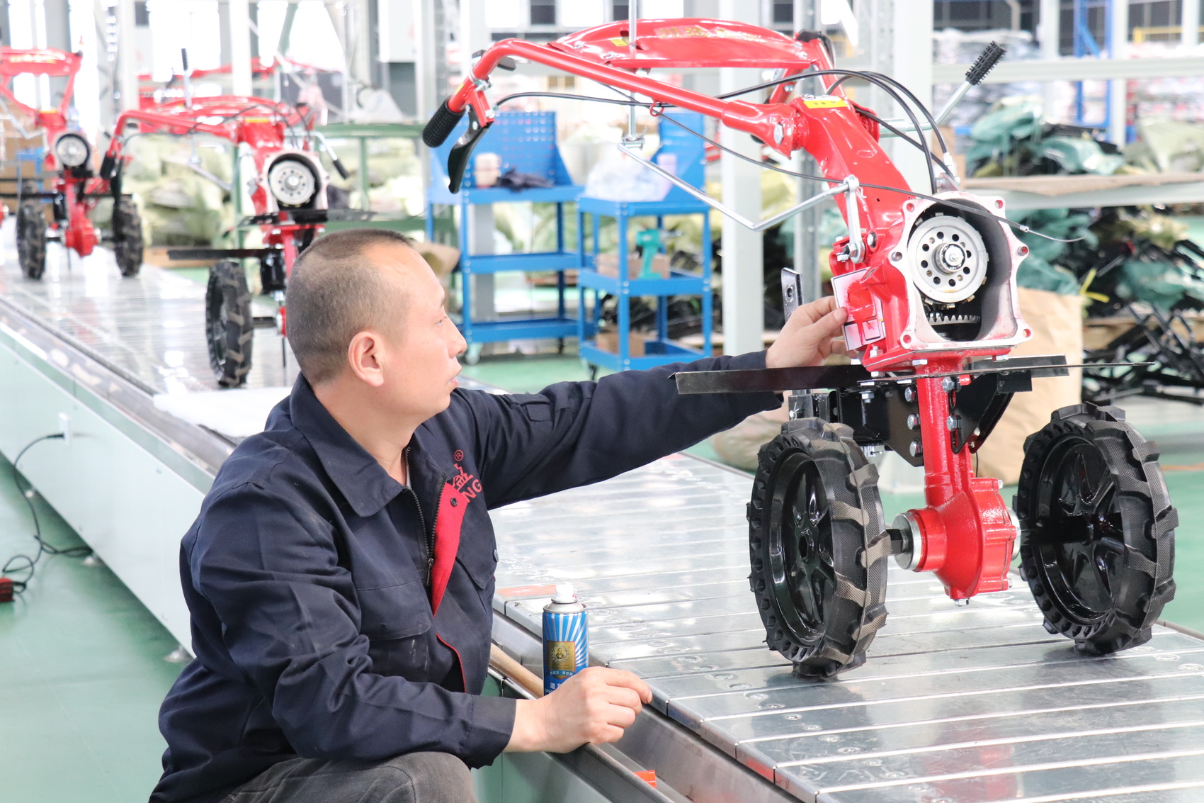 川达立盈农业装备有限公司车间,工作人员正在检查微耕机。杨迎 摄