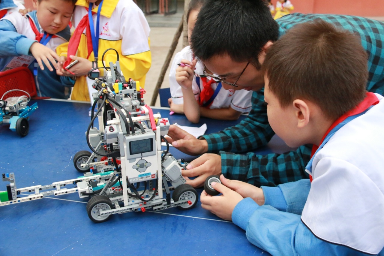 达州市通川区七小新锦学校的学生正在安装机器人。