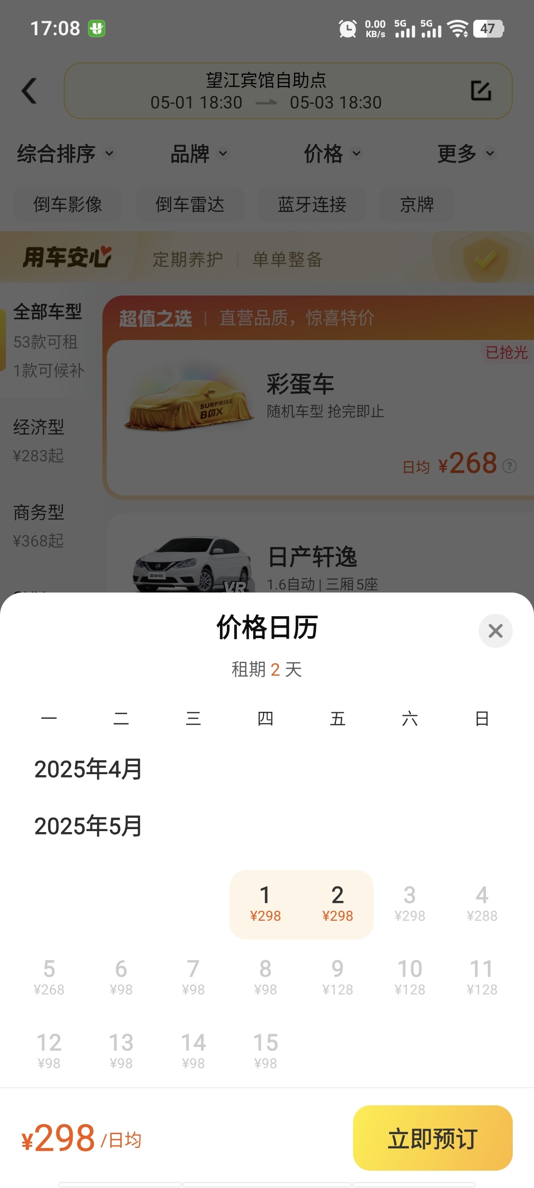 记者在神州租车客户端查询成都市5月1至3日的可租情况发现,从经济型到豪华型、从SUV到商务车,车源相对充足;但租金价格较平日有所上涨,经济型的大众朗逸日均价格为298元,5月6日以后的日均价格为98元。