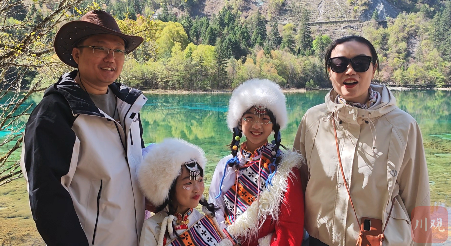 在层叠交错树正群海,二十多个大小海子如翡翠珠串般镶嵌在山谷间,梯级湖水经钙华堤坝分割,在阳光下呈现蓝绿变幻的奇观,是九寨沟最具代表性的景观带之一。“五一假期,我们一家四口来九寨沟旅游,九寨沟的景色非常非常的漂亮,两个女儿也是大小卓玛的装扮”。天津游客李女士一家不仅连连赞叹景区的美,还不断夸赞着景区的服务,“景区内所有的服务都很好,卫生间的环境也很干净。”