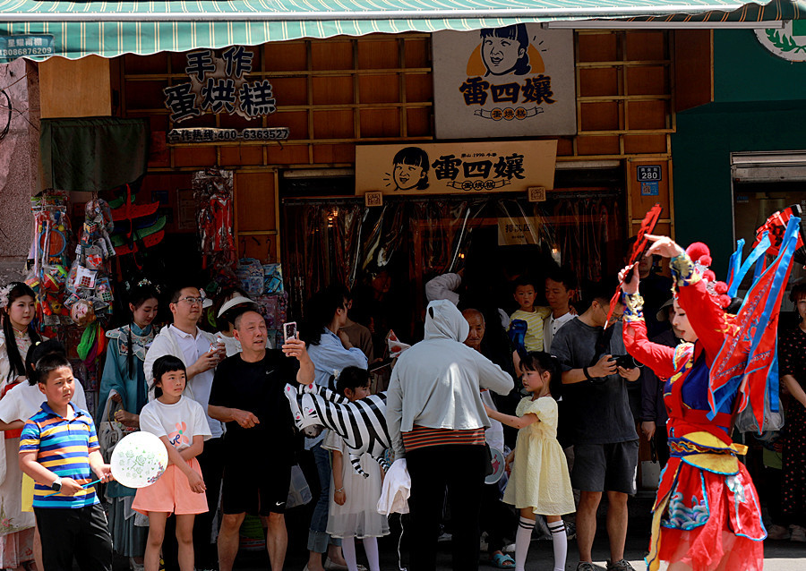 5月1日上午11点,美食街牌坊下,歌舞《千年盐城》演绎城市古韵,舞蹈《贰柒拾》展示巴适安逸的生活。周记麻辣烫——绿缘麻辣烫——八婆麻辣烫——雷四嬢蛋烘糕——各种花色的豆腐脑……跟着快闪巡游一路打卡美食一路吃,吃不完,根本吃不完。