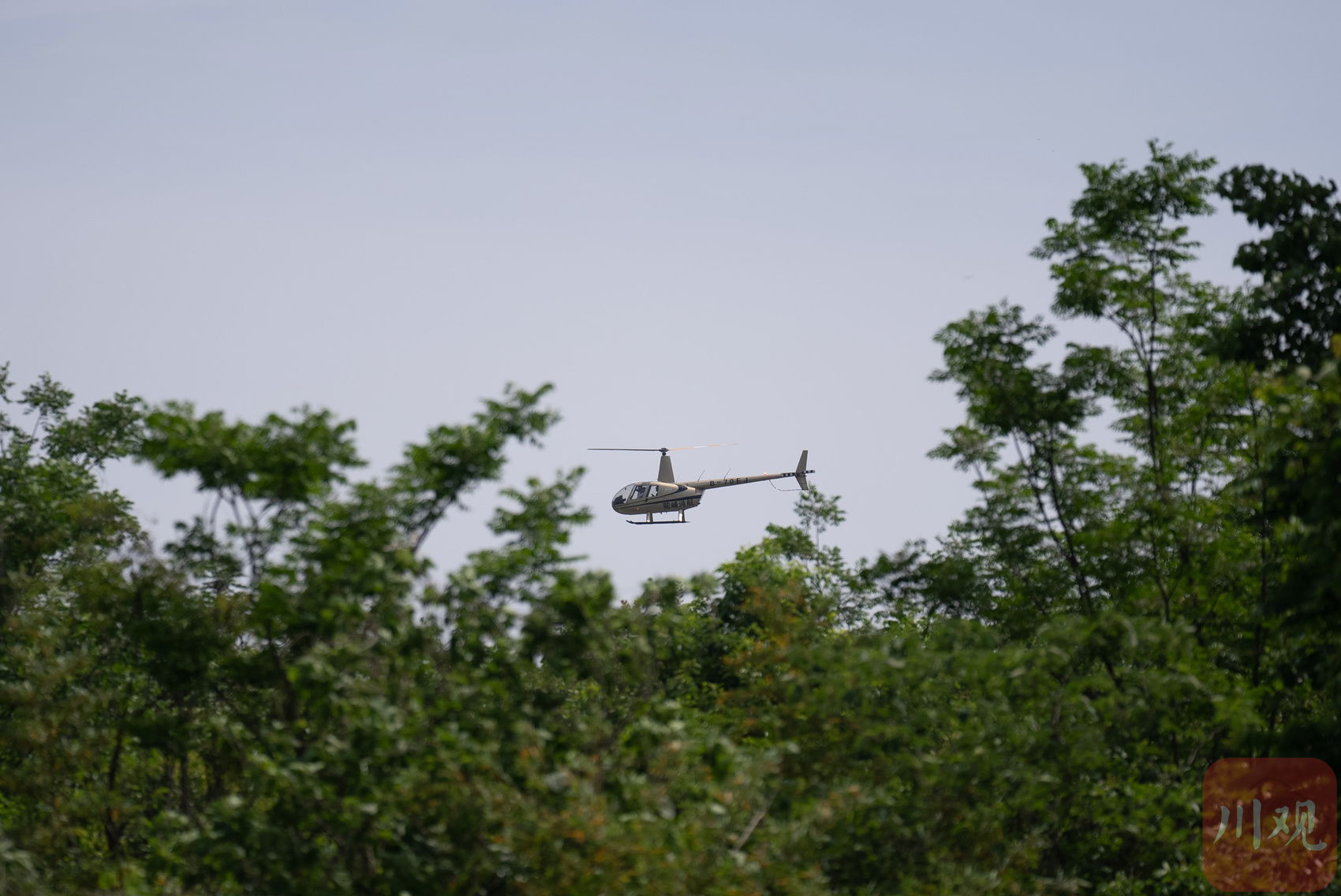 直升机与熊猫基地内的竹笋塔遥相呼应。