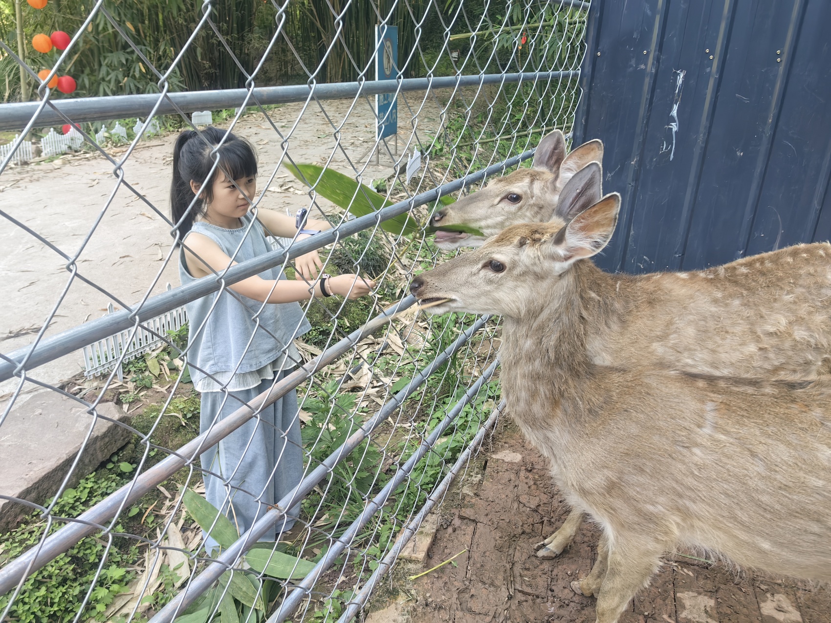 游客在八块田村体验投喂梅花鹿