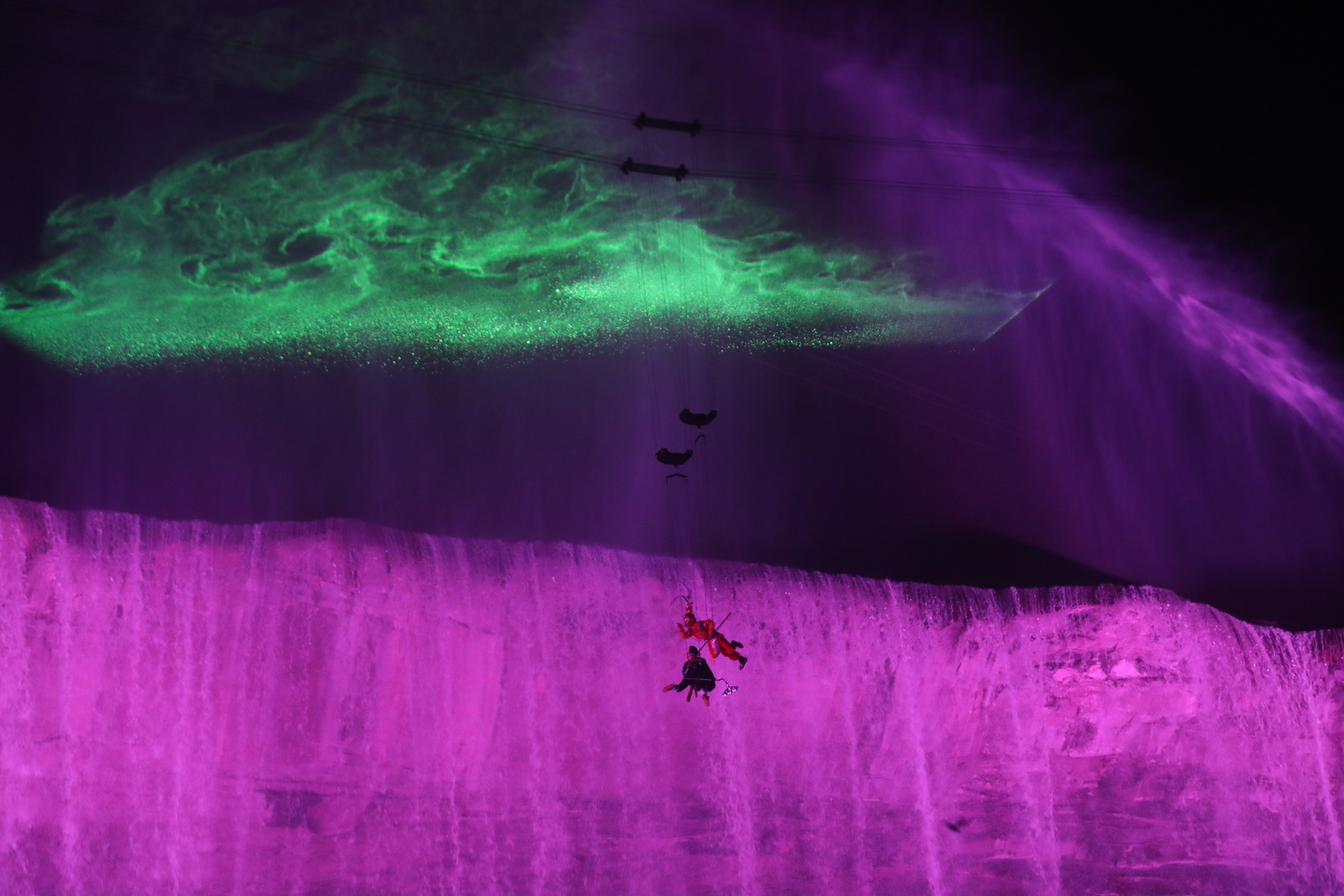 特技演员在低坑瀑布景区夜晚灯光秀中表演(毛业文 摄)