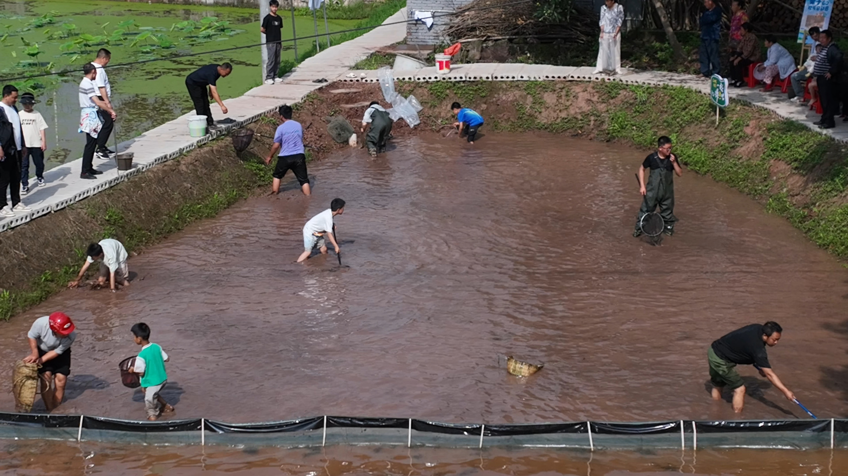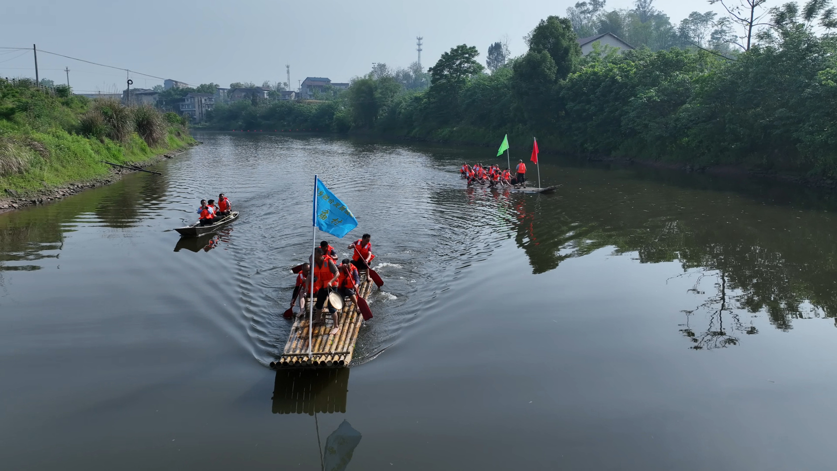 5月2日,走进武胜县鸣钟镇小寨村,郁郁葱葱的树林宛如天然屏障,带来阵阵荫凉。在嘉陵江支流长滩寺河上,一场划竹筏比赛正如火如荼地进行着。游客们自由组队,竹筏上的“运动员”齐心协力划桨,阵阵鼓声让现场气氛热烈非凡。而在另一侧的水塘里,孩子们正在兴奋地参与混水摸鱼游戏,沉浸式感受“村游”景韵。