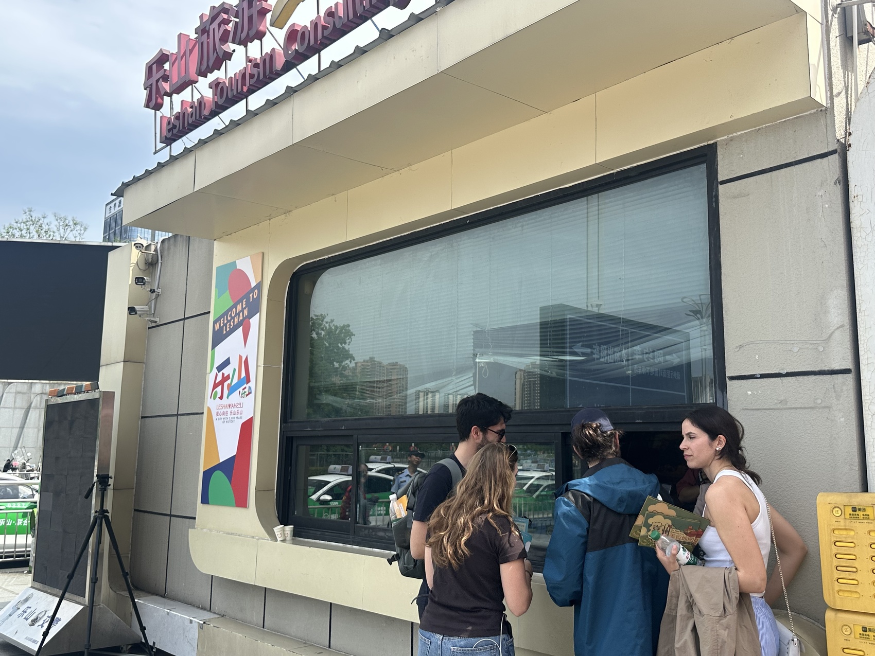 外国游客在旅游服务点领取双语服务资料