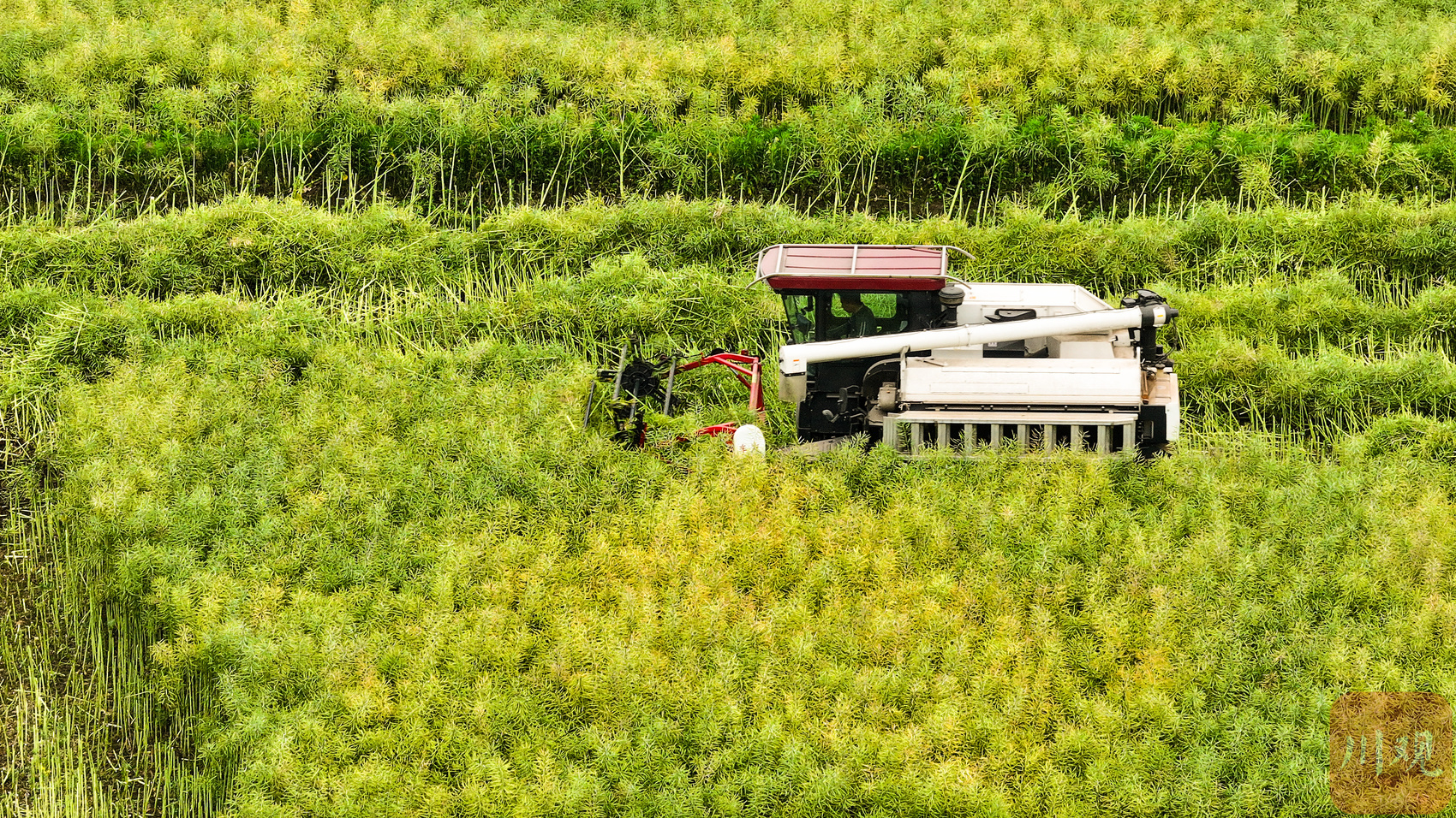 伴随着收割机的轰鸣声,一排排青黄色的油菜应声倒下,整齐堆放在田间。田野的另一边,前期割倒的油菜经过一个周的自然晾晒,已呈现出成熟的金黄色,大型捡拾机,正忙碌着将一排排晾晒好的油菜进行脱粒、分离。随着机械前端的滚轴不停转动,整齐码放在田间的油菜被快速吸入机器里完成脱粒,粉碎的秸秆源源不断从机器后方喷洒向田间。