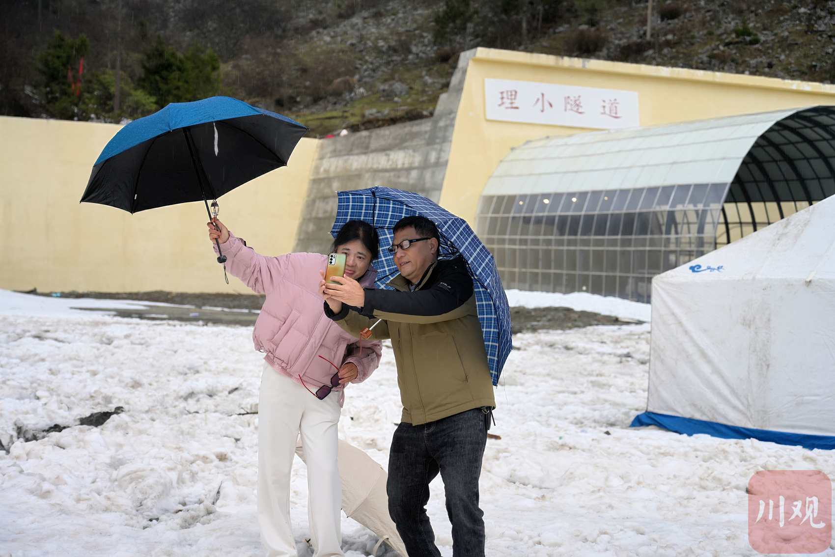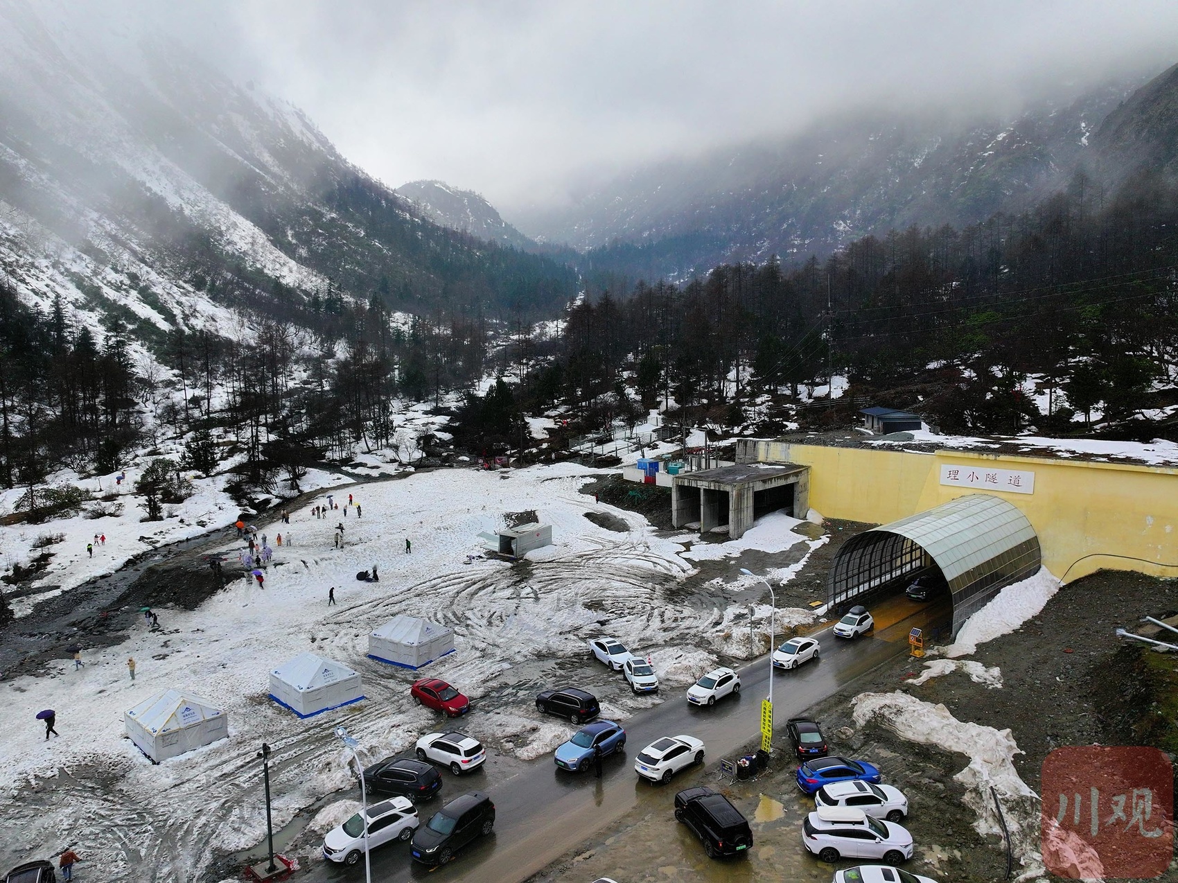 5月3日,四川阿坝州理小隧道外飘起了雪,不少游客把车停在公路边玩起了雪。