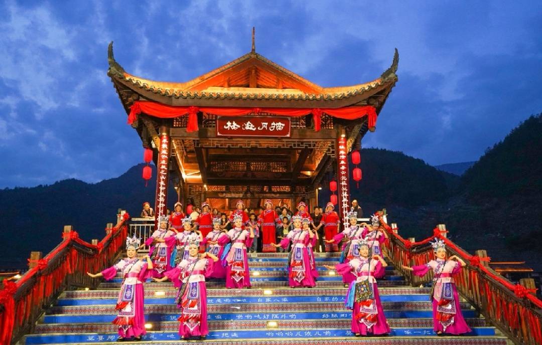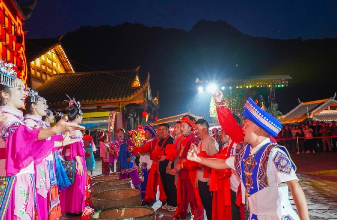 4月30日,当夜幕缓缓降临,灯光点亮白虎广场,土家儿女倾情演绎“巴风土韵 喜嫁千年”沉浸式巴山土家婚俗非遗秀。